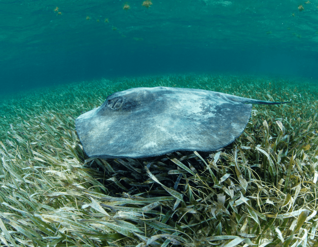 A nurse shark and a Caribbean whiptail ray resting on a seagrass bed. CC Rachel Graham/MarAlliance