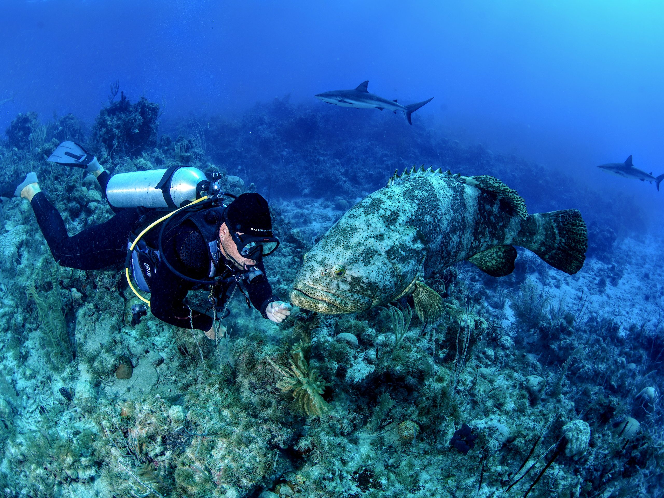 Inhabiting shallow waters up to 150 feet (46 meters) deep, the goliath grouper prefers reef, rock and muddy bottoms. A solitary creature, the adult goliath grouper occupies a limited home range, normally including a place of safety such as a cave or ledge. In displays of territoriality, the goliath grouper will open its mouth and quiver its body. Sometimes, an audible ‘boom’ can be heard emanating from the fish, which stems from the contraction of its swim bladder. The goliath grouper is listed as critically endangered by the IUCN, mostly due to overfishing. The goliath grouper spawns in the same location year after year, making aggregation patterns easy to predict. Furthermore the goliath grouper is an easy target for spearfishermen given its large size, slowness, and lack of fear towards humans. Although it is a preferred fish for eating, studies have found that the levels of methylmercury in goliath groupers larger than 55 cm (22 inches) are higher than that recommended by United States governmental advisory criteria for human health.