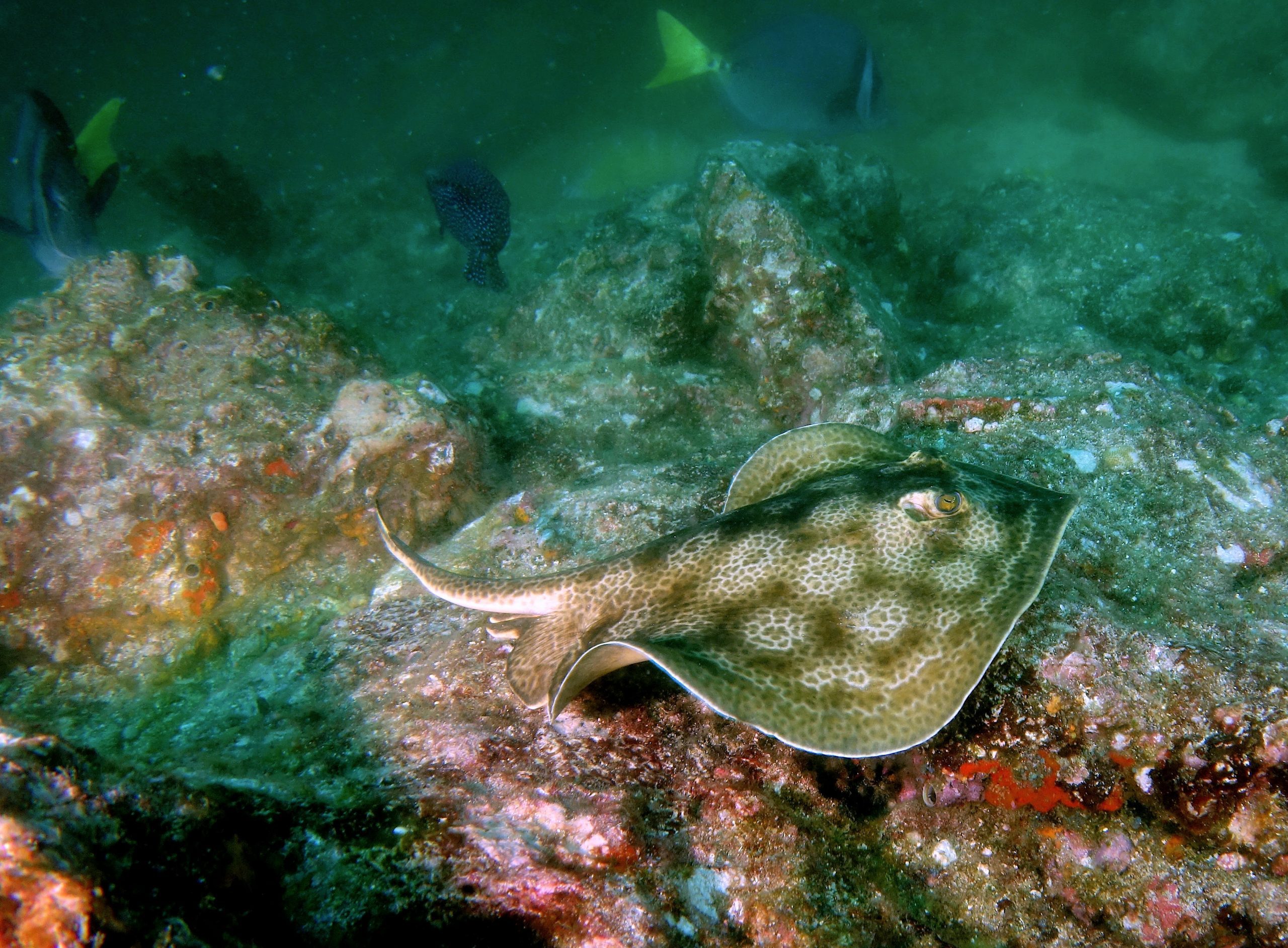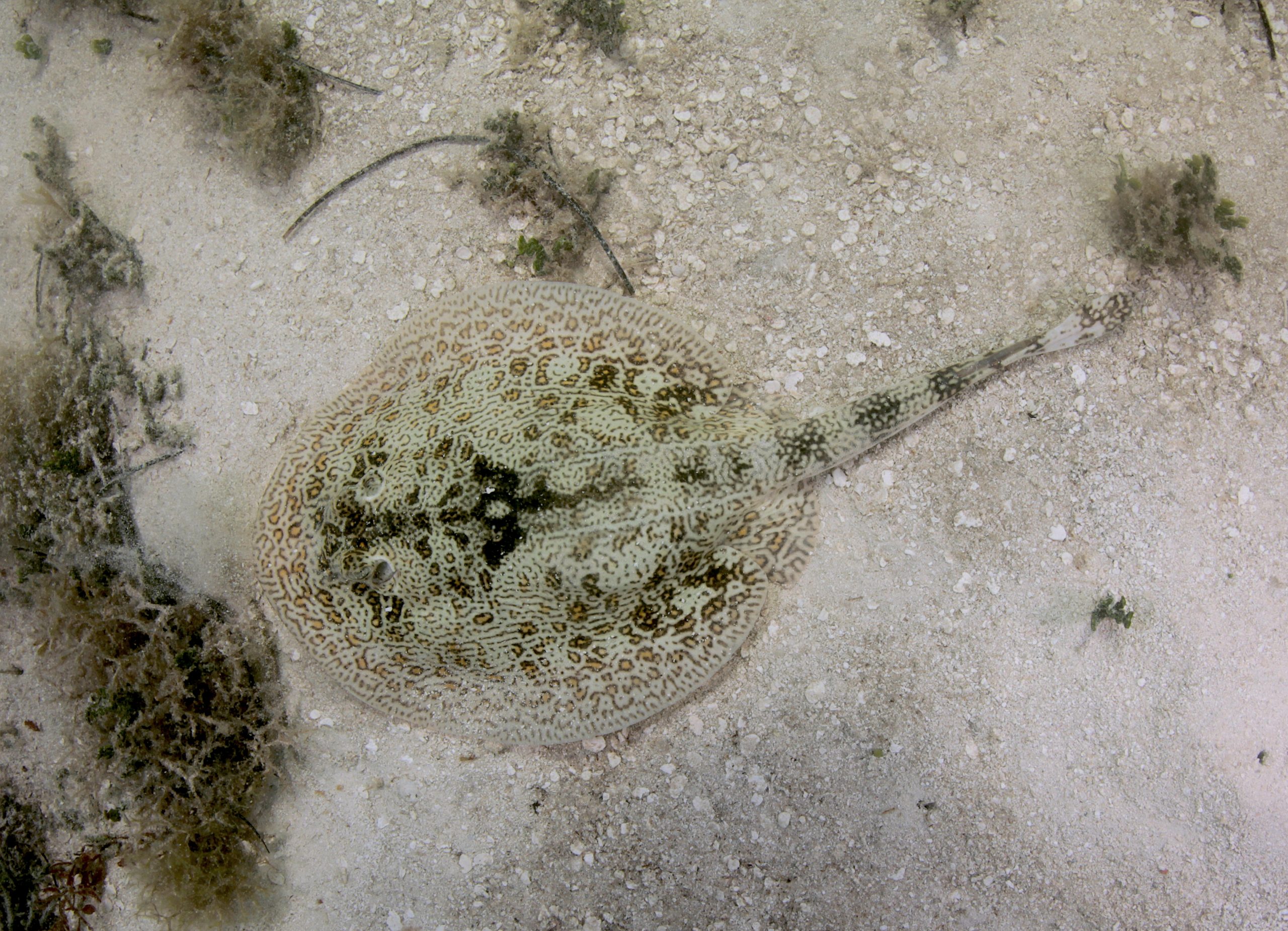 The yellow spotted stingray (also known as the yellow stingray or the maid stingray) can be found in tropical, sandy-bottom and seagrass habitats. Occupying shallow depths ranging between 1 and 25 meters, it can be found near sandy beaches and the edges of coral reefs. Like most rays of the Urotrygonidae family, the yellow spotted stingray has a flat, round body and no dorsal fin. It also possesses a venomous tail spine, though it only uses it for defense. Individuals can vary widely in pattern and coloration, presenting from a pale beige-ish color with greenish brown spots to dark in color with pale white or gold spots. The yellow spotted stingray is predated upon by larger fish. While the yellow spotted stingray is listed as “least concern” on the IUCN Red List, it is worth noting that this stingray is often caught as bycatch. Furthermore, its habitat and food sources are becoming increasingly threatened by climate change and anthropogenic activities.